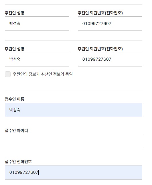 추천인과 후원인 성명을 작성하면 회원 간 소통이 가능하니 꼭 작성해 주세요.